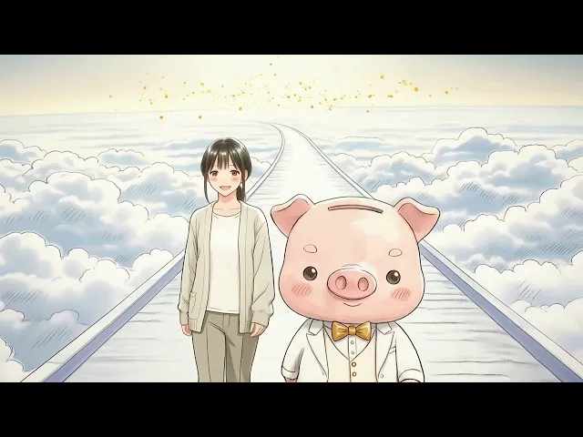 福豚の挿入口にコインを入れると“願いの扉”が開き、案内役の福豚が異世界へ導く——という映画的設定を提示し、